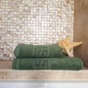 Prețul inițial a fost: 56,00 lei.45,00 leiPrețul curent este: 45,00 lei.Prosop baie Greek Border Jacquard – 100% Bumbac, 500g/mp, verde-olive