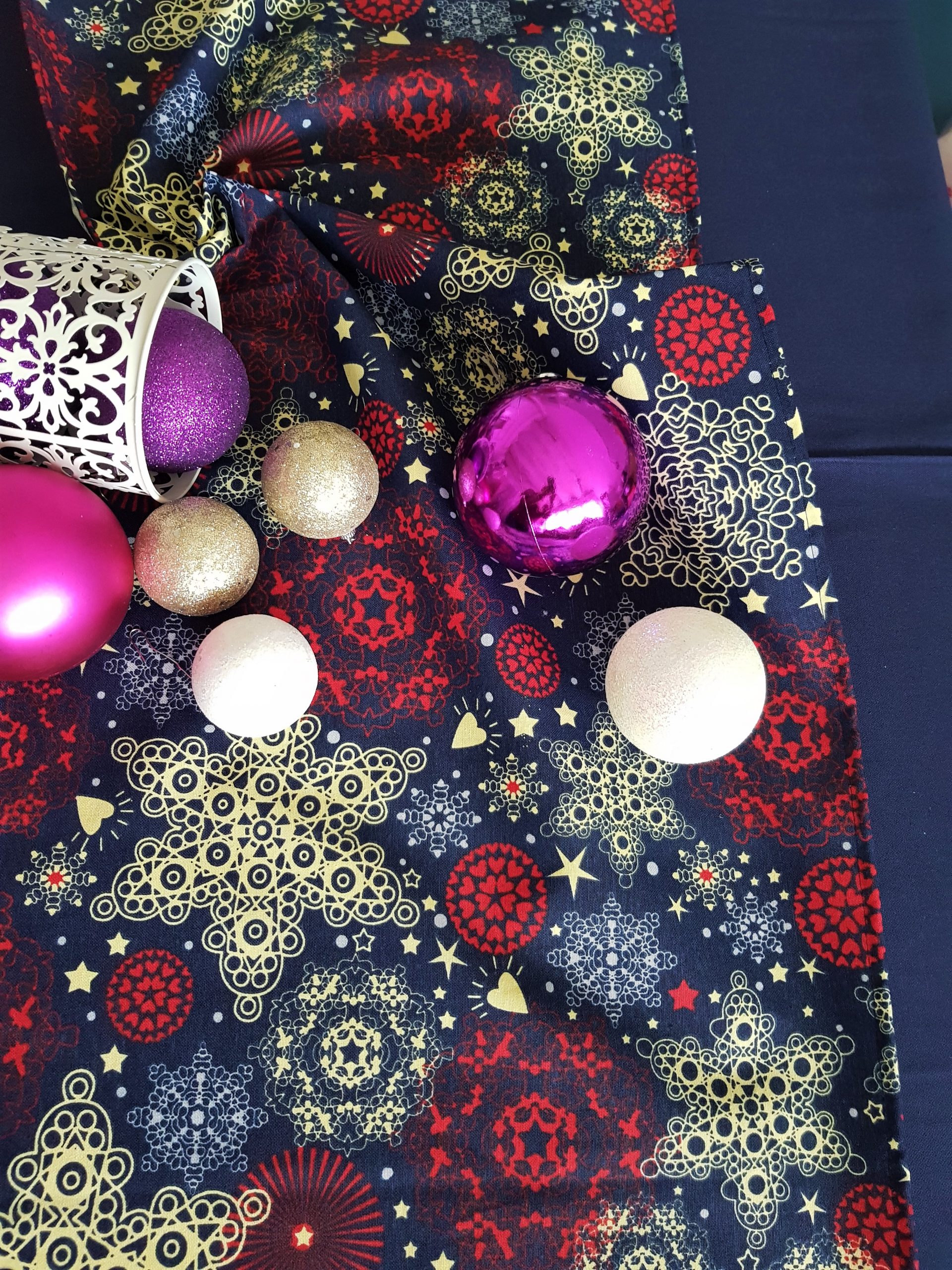 Culoare: fata de masa albastra si napron albastru cu decor Craciun