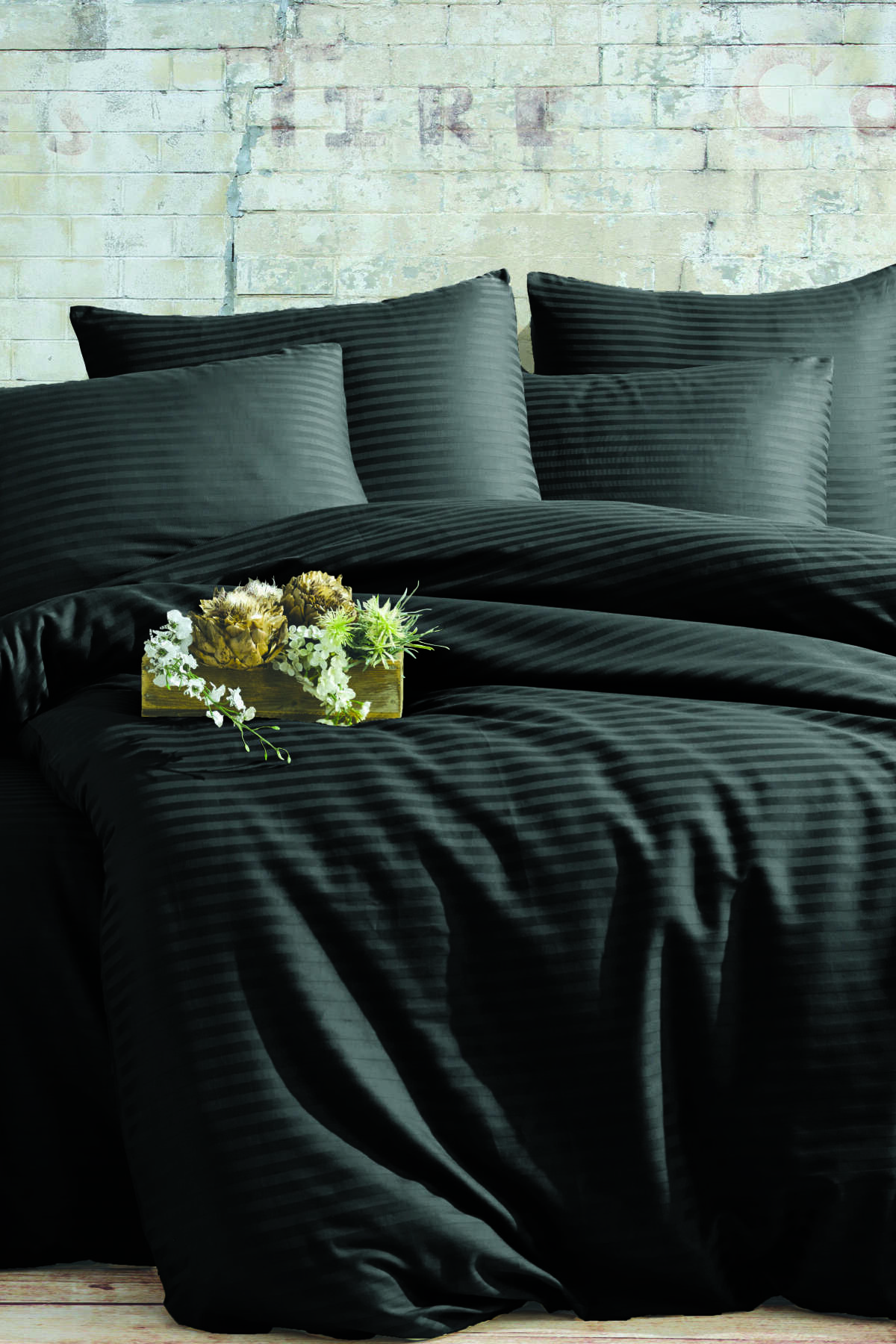Lenjerie de pat King Size, damasc saten color dungi inguste 1 cm, 100% bumbac, negru