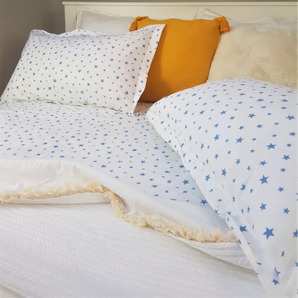Cearceaful de pat este finisat pe margine cu tiv de 1 cm, prin coasere cu ata alba, iar fetele de perna au margine decoraiva de 4 cm, cu inchidere cu flap, pe toata latimea de 50 cm. Materialul este petrecut aproximativ 15-20 cm, pe verso, asigurand fixarea umpluturii in interior.