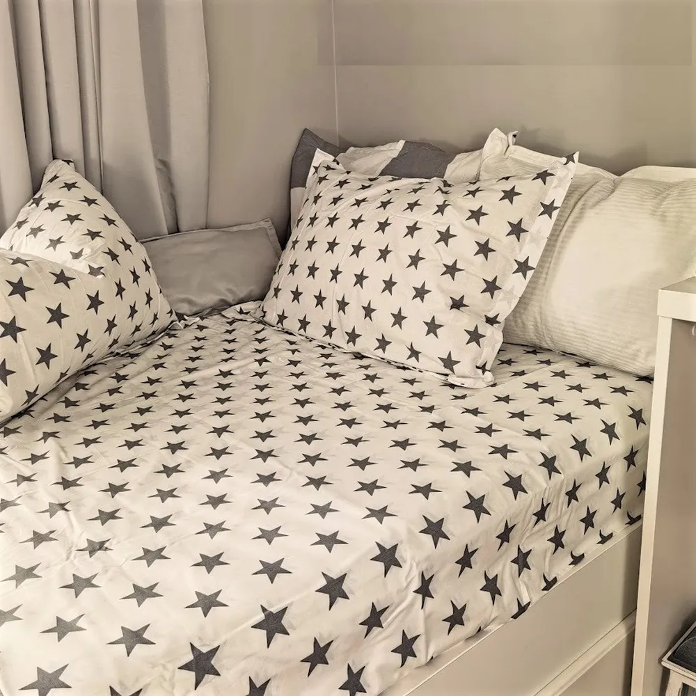 Cearsaful de pat este finisat pe margine cu tiv de 1 cm latime, prin coasere, iar fetele de perna au inchidere tip flap pe verso, pe toata latimea si sunt finisate cu rame decorative de 4 cm.
